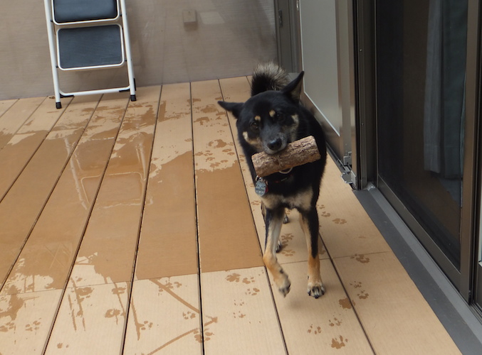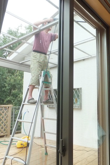 先日の台風でデッキの屋根が飛んで空が開けたので、今のうちに汚れた壁や屋根のお掃除をします。