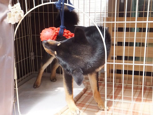 おもちゃのダンベルにおやつをいれて吊り下げてみました。