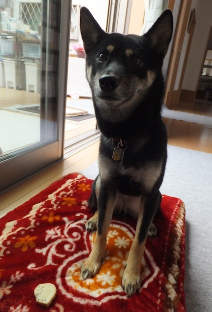 ごまパンを前に畏まってお座りする黒柴ルイ