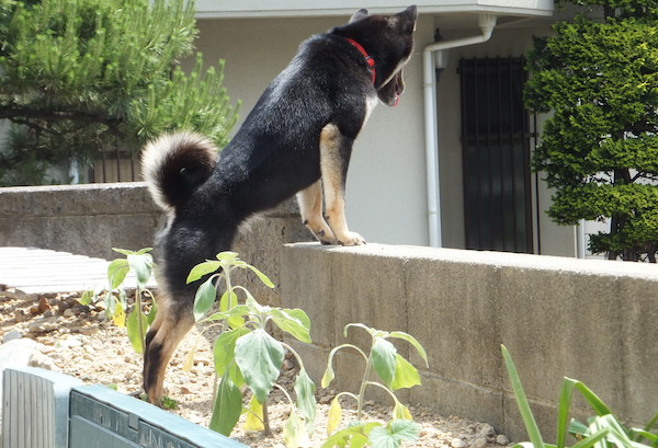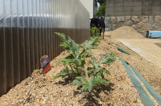 スイカも唐辛子も順調。。に見えましたが、スイカの葉っぱがナメクジに食べられて黒くなっちゃってました><。