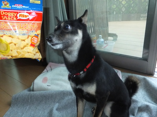 アニマルビスケットを前にお座りする黒柴ルイ