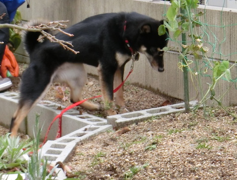 畑仕事に飽きたルイちゃんはアネモネの葉っぱを試食中。