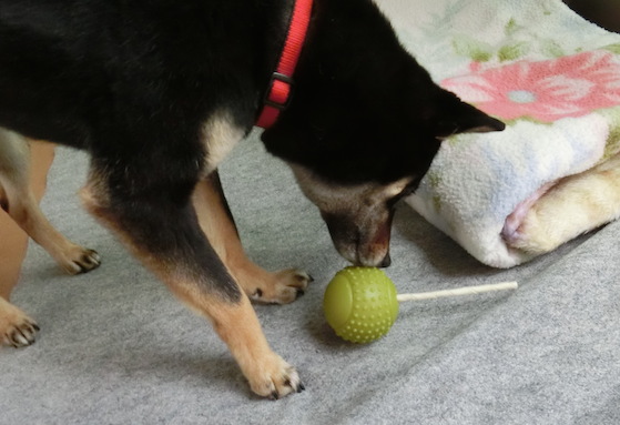 今度はテニスボール ラグビーボールに棒ガムを挿したことで、ちゃんと棒ガムを持って食べられるようになったルイちゃん。 今度はテニスボールに棒ガムを挿してみました。 ラグビーボールのときは最初戸惑っていたけど、テニスボールでは平気みたい。 早速くわえてウロウロ。 いつもの毛布に持ってきて食べるのかと思いきや・・・ 遊び始めちゃった^^; 転がり方が楽しかったみたいです(笑