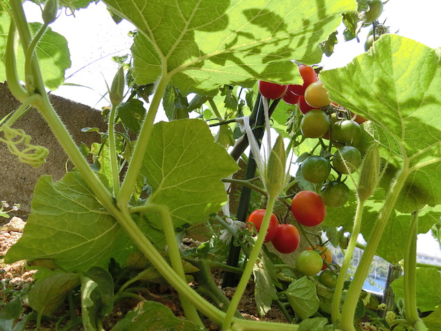 トマトがかわいそうなので、カボチャの蔓は解いてあげましたよ^^